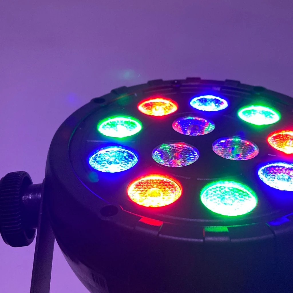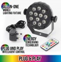 Delivering very impressive specifications from its size-defying, stylish, compact design, the Kam Mini Par 12 USB Light, with 12 powerful colour changing RGBW LEDs, produces an array of rotating, dazzling, room-filling patterns and effects from a packed menu of sophisticated Auto show and Sound activated programs, operable manually or via the included wireless remote controls.