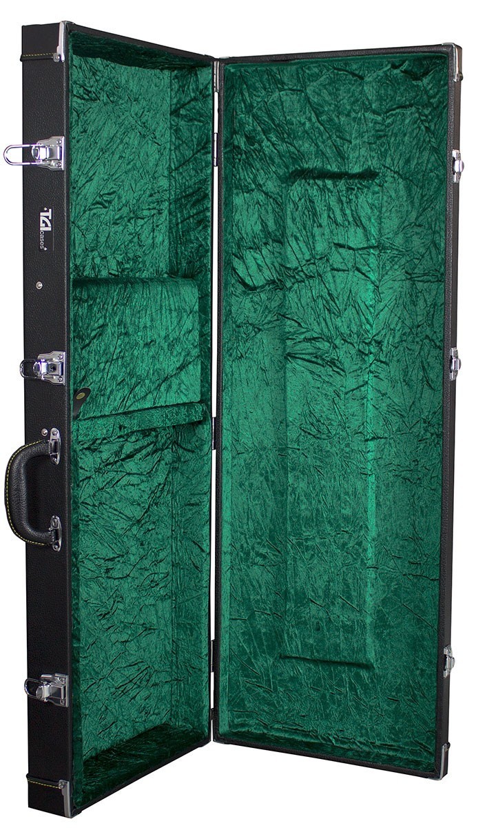 Wooden Hard Shell with Black Leatherette Outer Cover and Accented Stitching. Grey Plush Lining. Solid Grab Handle. Strong, Durable Metal Clasps. Internal Measurements. Length: 101cm, Lower Bout: 32cm, Upper Bout: 32cm, Depth: 9cm.