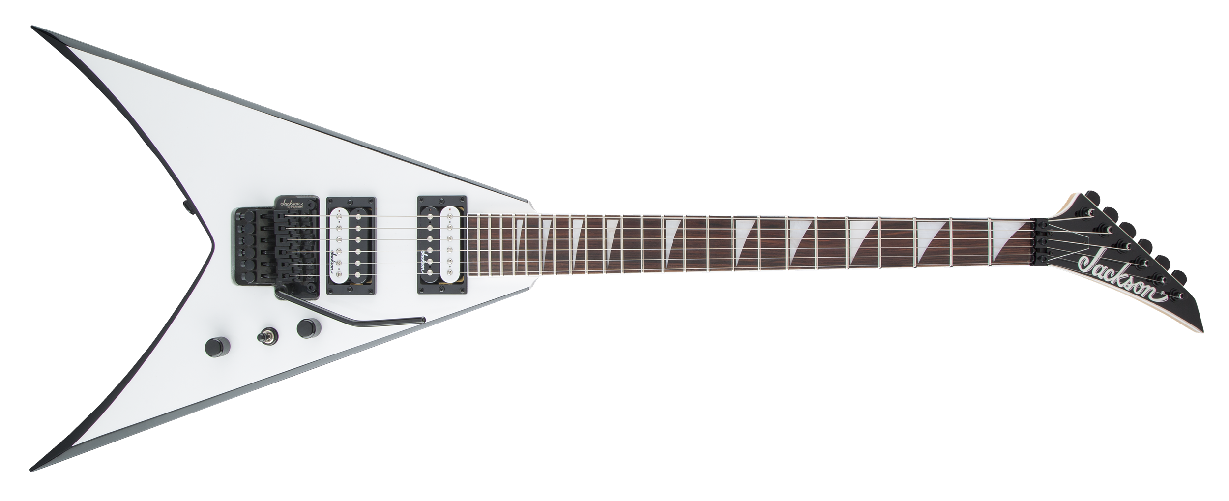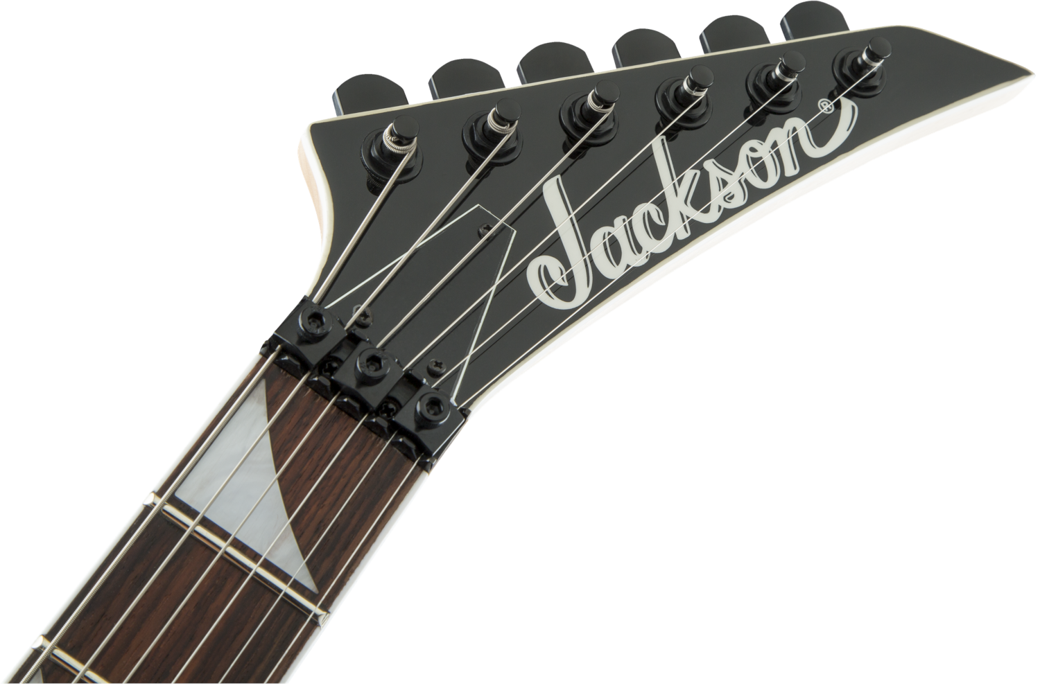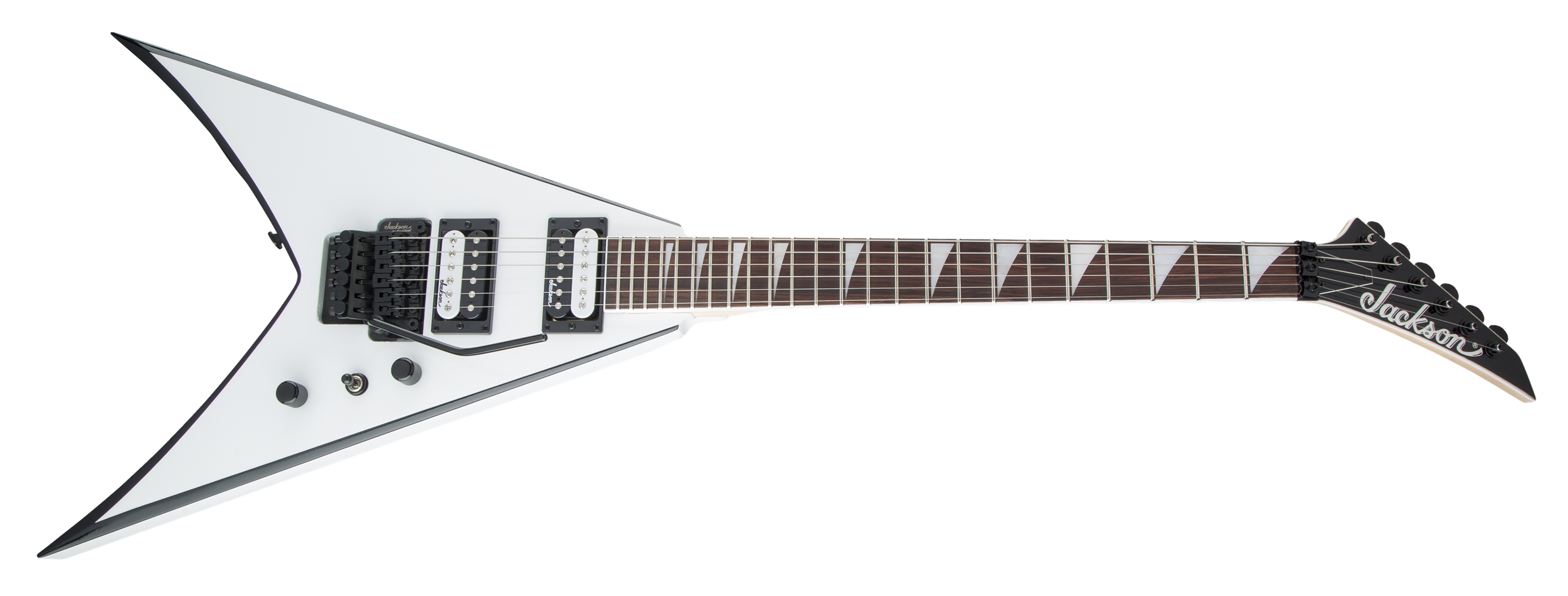 Other features include dual Jackson high-output humbucking pickups with ceramic magnets and three-way toggle switching, Jackson-branded Floyd Rose® double-locking tremolo bridge, standard strap buttons and sealed die-cast tuners.
