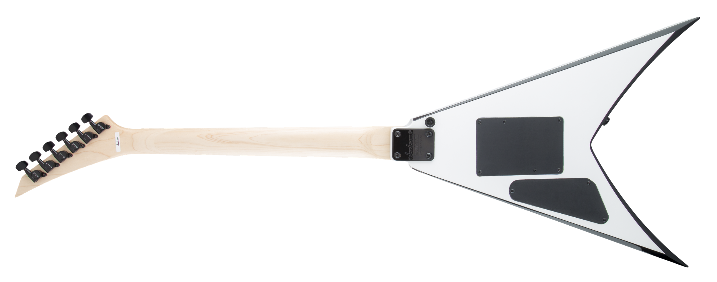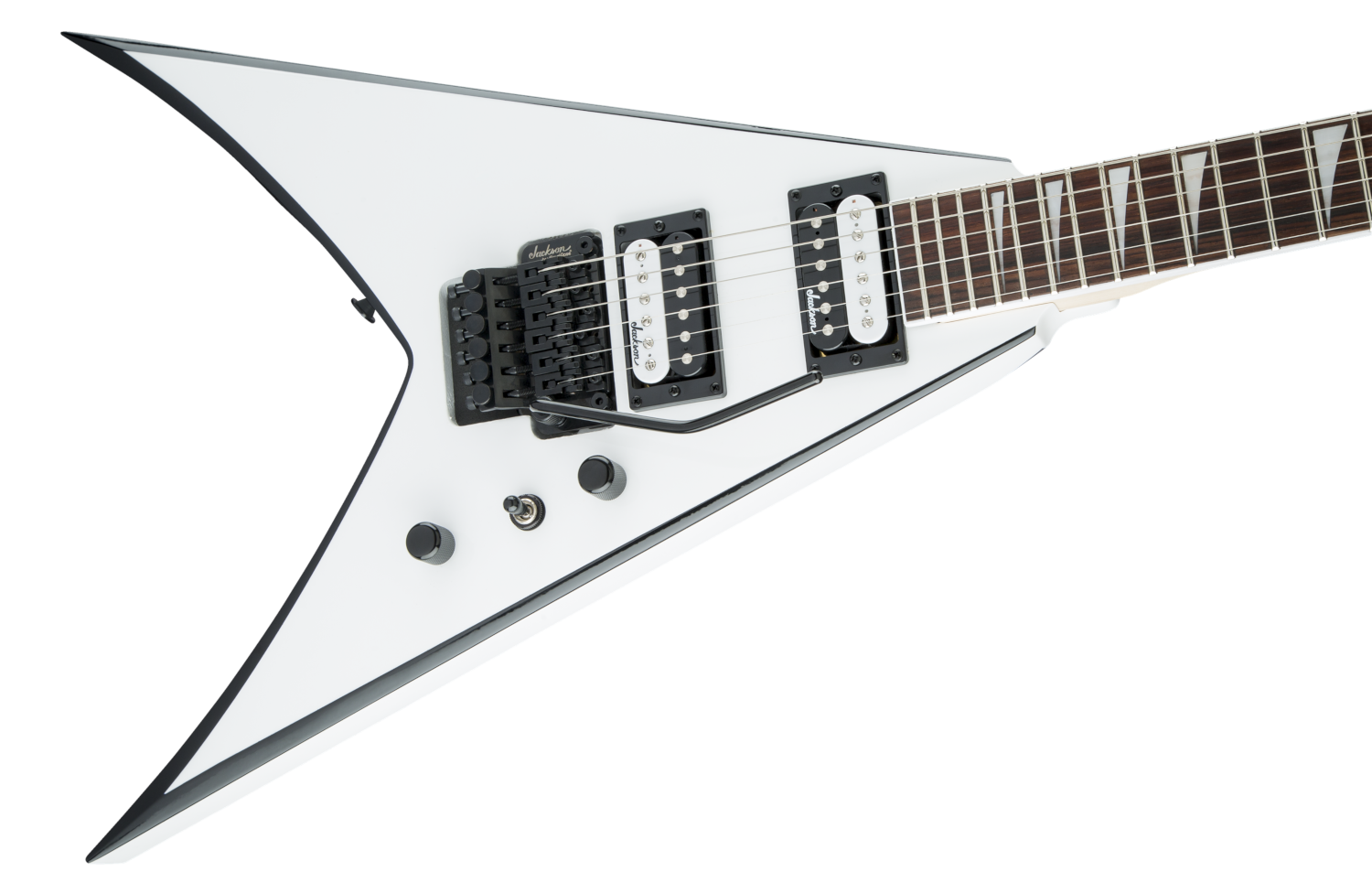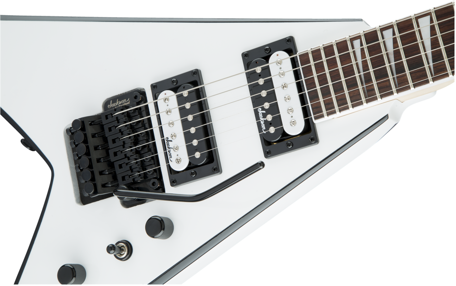 Other features include dual Jackson high-output humbucking pickups with ceramic magnets and three-way toggle switching, Jackson-branded Floyd Rose® double-locking tremolo bridge, standard strap buttons and sealed die-cast tuners.