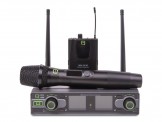 UHF dual channel wireless microphone system, supplied with 1x Handheld Transmitter, 1x Beltpack Transmitter (to be used with either 1x Headworn Microphone, 1x Lapel Microphone, 1x Guitar Cable - all options supplied!)