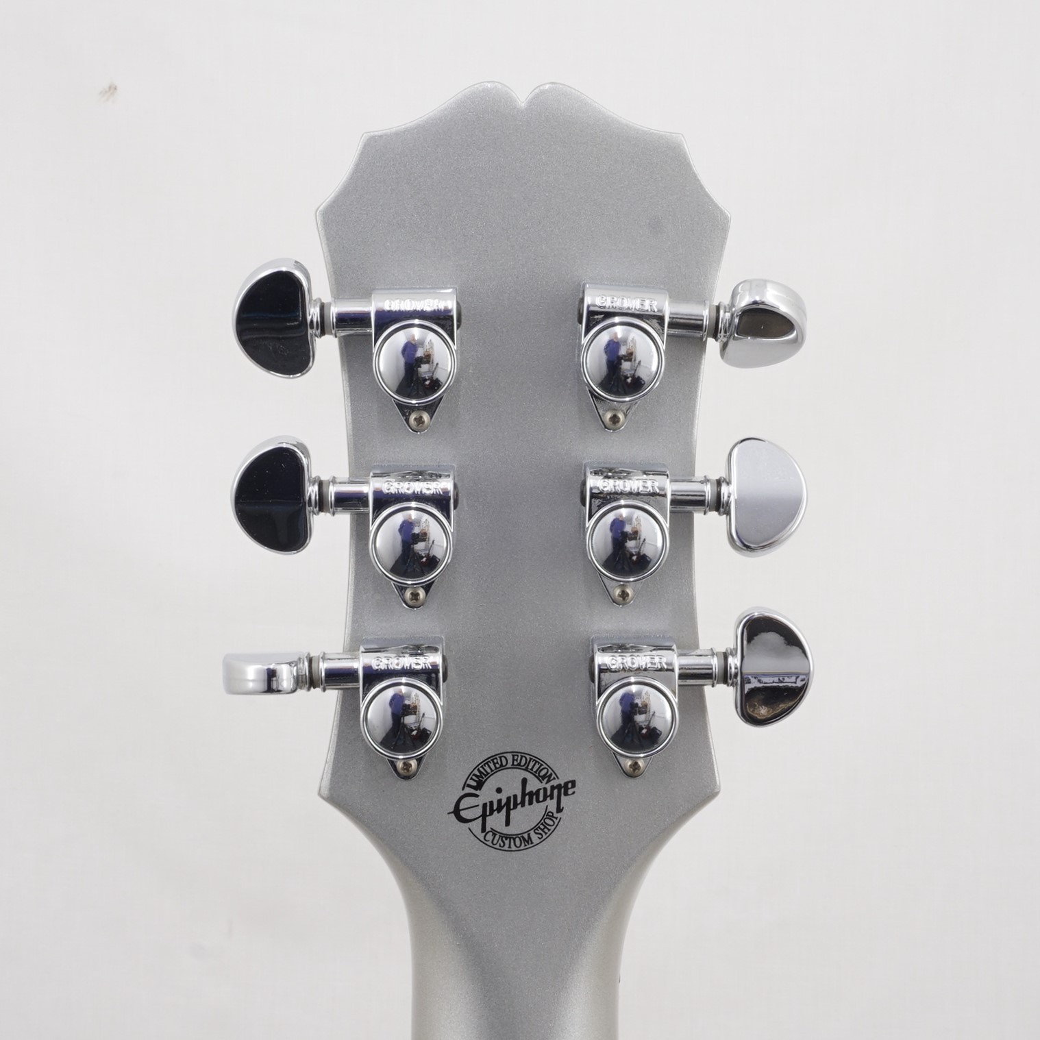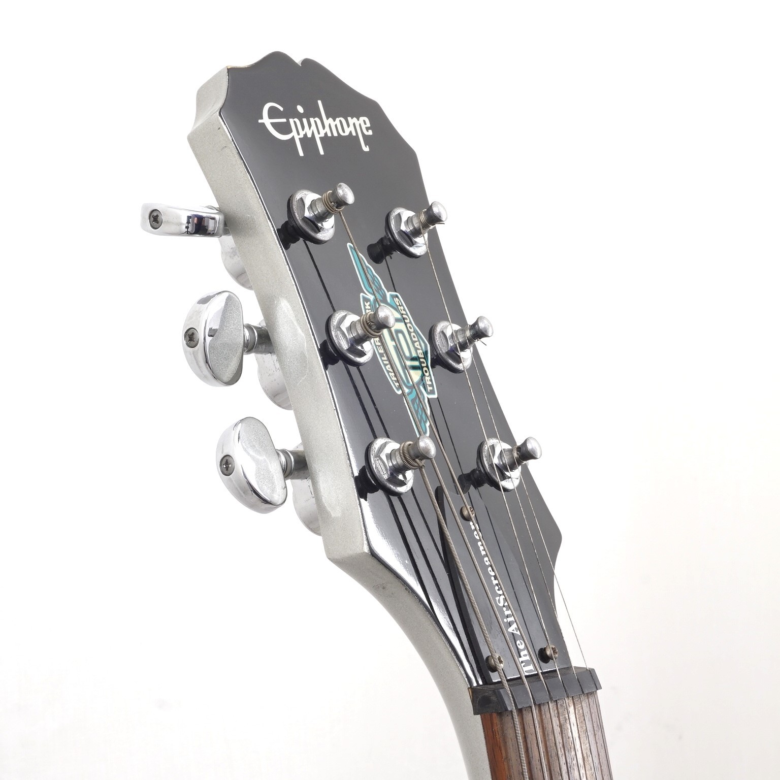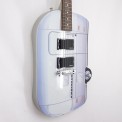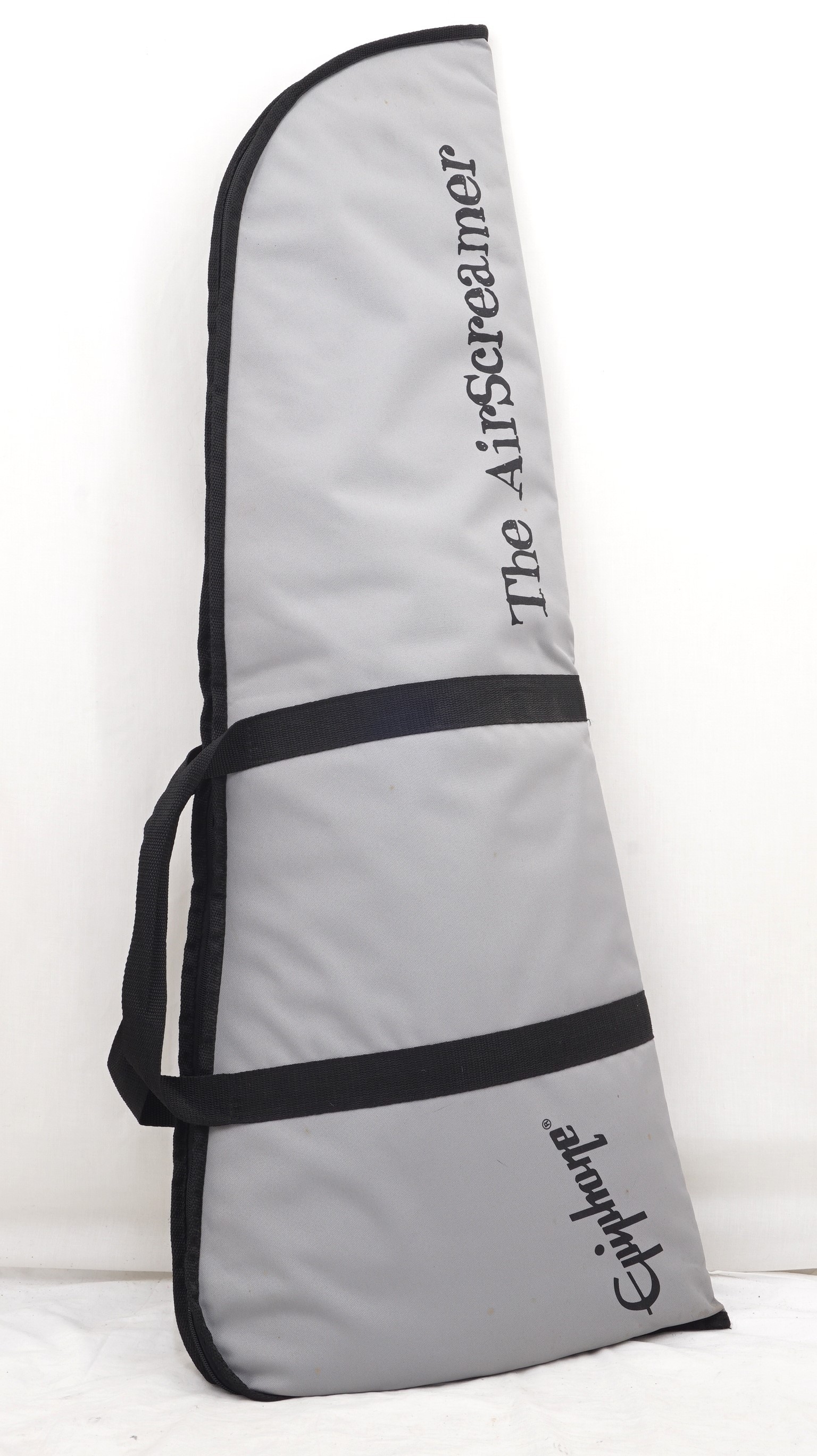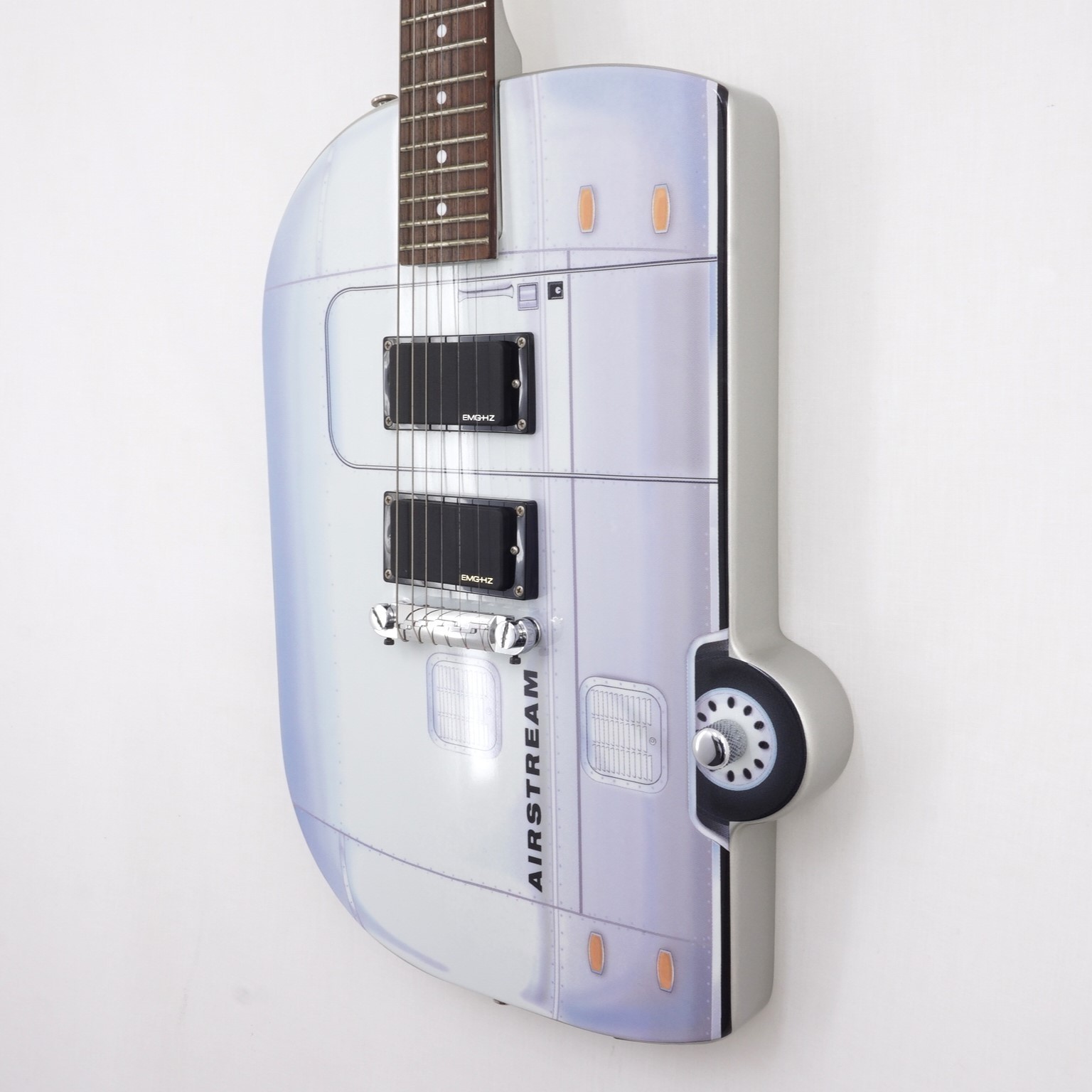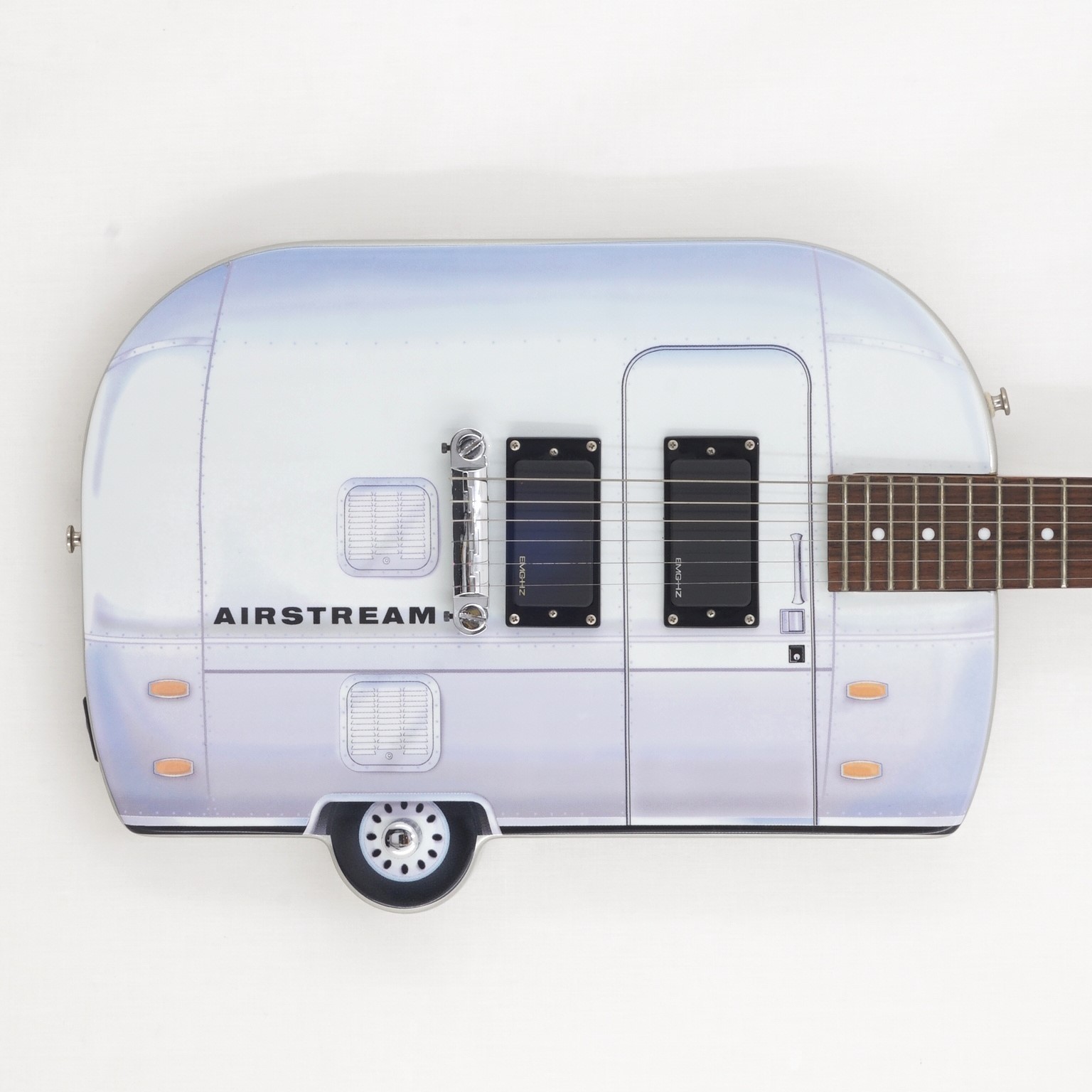 The body of the guitar is shaped like the popular Airstream "Bambi" trailer - complete with a volume control knob for a hub cap - that has been a familiar sight on America's roadways since the 1960s, and the model is officially licensed by the Airstream company. The Epi Airscreamer is also an official artist signature model for the Trailer Park Troubadours, the cult band that glorifies the "trailer lifestyle" with such songs as "I Live in Aluminum" and "It Ain't Home Til You Take the Wheels Off."